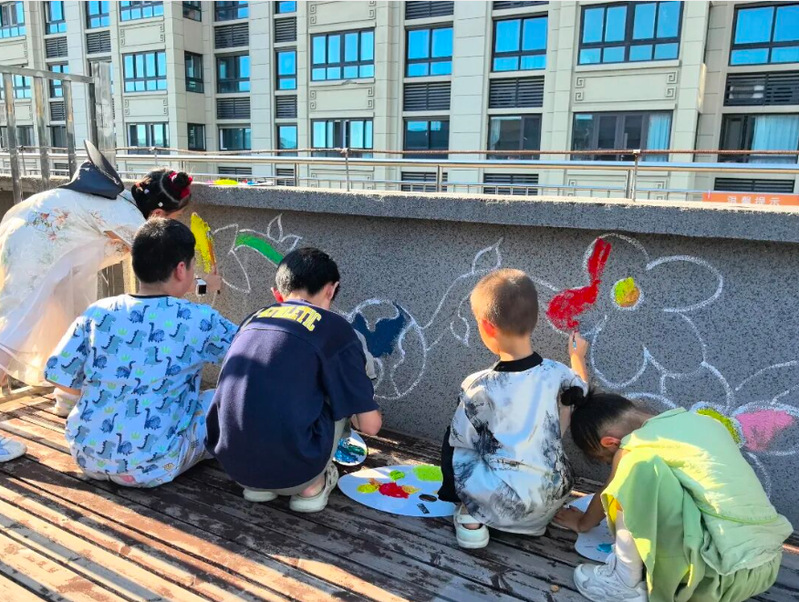 完成手工作品后,孩子们将环保理念带到了社区的墙面上,用画笔来表达心声,跟随实践团成员一同来到社区宣传墙参与以塑料污染为主题的环保宣传墙绘。在实践团成员的引导下,孩子们按照分工,有的负责勾勒轮廓,有的进行色彩填充,有的写下环保标语。墙绘的完成吸引了社区居民的关注,为塑料污染提供了一个长期展示的平台,也将环保理念传递给更多人。
